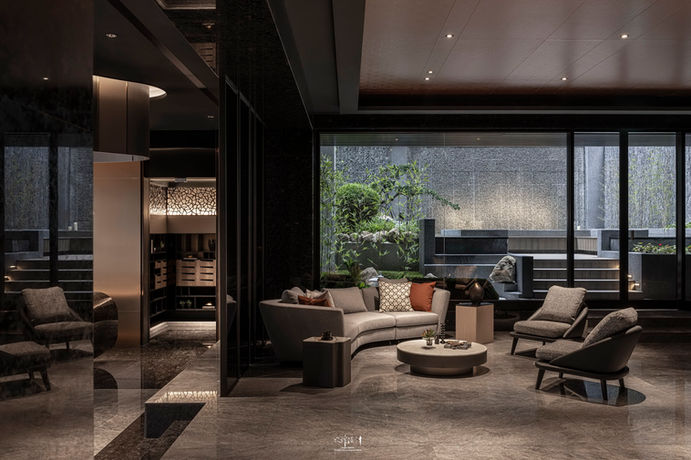 樂山之名,樂於山形的延展,也樂於人在其中的移動與停留。 源自山林間層層疊嶂、光影穿梭的自然意象。空間以現代語彙重塑「山的輪廓感」,透過層層懸浮的曲面量體,形塑如山巒般起伏的空間節奏,轉化為流動的風景。