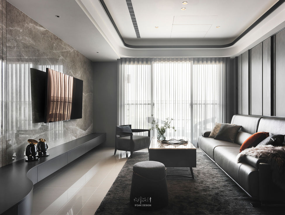 在這個作品中,我們以「光影」作為空間的靈魂。當晨曦透過紗簾輕灑入室,光在立面與家具之間遊走,時間彷彿被柔化,留下細膩的溫度。整體配色以沉穩的灰階為主軸,灰與黑的比例精準拿捏,奠定現代簡約的基調。牆面透過立體分割線條向上延伸,賦予空間高度感,同時帶來秩序與節奏。材質選用上,我們結合了石材的剛毅、木質的溫潤與皮革的細膩觸感,讓空間兼具視覺的層次感與居住的舒適度。在低飽和的背景中,局部注入橘色抱枕、毛氈與金屬燈飾,宛如畫布上一筆靈動的色彩,喚醒空間的情緒。餐廳與客廳之間以開放式動線串聯,生活的日常因此更流暢自然。
