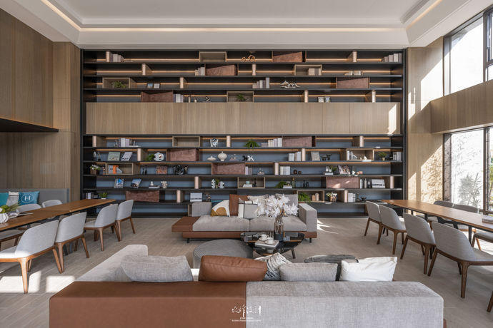 往內走為沙發區域的交誼空間,再進入為吧檯區域。一側窗邊有設置座位區,銜接戶外自然景觀。另一側是圖書閱覽室,窗邊也有設置座位區,窗型為折疊式落地窗,可打開走向戶外的木平台上 ,讓景觀與室內情境交融。