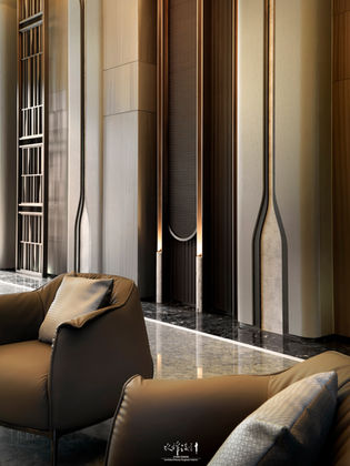地坪選用自然大理石與灰階跳色鋪陳,以反射光感強化挑高感,並延展整體空間的典雅尺度。色彩與肌理的對話,構築出一種靜謐卻不失張力的迎賓氛圍,如同城市中的高端藝 廊,一場關於風格、格調與溫度的靜靜開場。