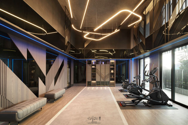 天花以有機型環狀燈飾與柔弧曲面串聯視覺中心,搭配金屬飾條與隱藏燈帶,使光成為天幕下流動的語言,洗鍊中蘊藏暖意。局部以金屬網板與金屬漆壁面搭配金屬烤漆包覆,讓空間在堅實的材料語言中注入輕盈的視覺穿透。