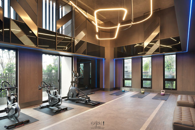 挑空尺度下,自然光與金屬光澤 交錯流動,打造輕盈卻不失份量的社交空間。牆面以大面積淺灰石紋板搭配飾條層次堆疊,與局部大理石牆面對話,呈現沈穩且具現代感的空間語境。天花金屬吊燈與立面玻璃材質交錯反射,形塑開放且細膩的空間風格。