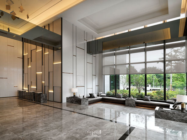 以「書冊」型態作為大廳主牆的主視覺語彙,不同量體感與分割的石材牆體與玻璃框面,或實蔽,或穿透,帶出空間虛實交錯變化。