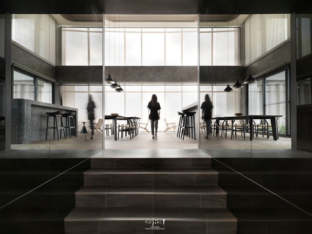 頂樓打造吧檯星空概念的空間,享有無建築遮蔽的優勢,透過階梯處的玻璃立面、挑高落地玻璃,將天空、城市的美景延展到室內;空間裡藉由人文古蹟的紅磚材質堆疊,堆砌出生活裡每一刻的記憶。