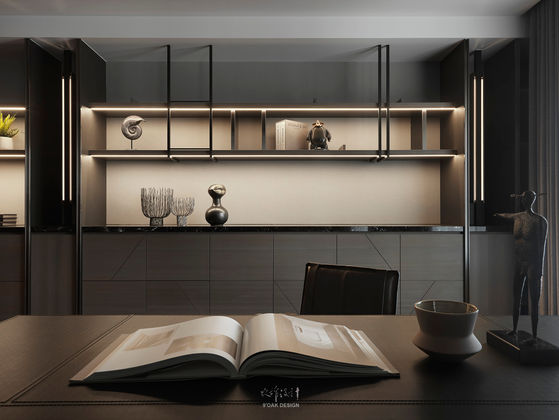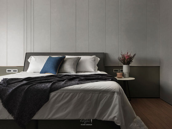 主臥室空間中以電視牆結合中島吧檯的方式連結書房,書房來自書卷的氣息,用「木皮」構一個場域的氛圍,沈澱下來的是對於「閱」的片刻憧憬。